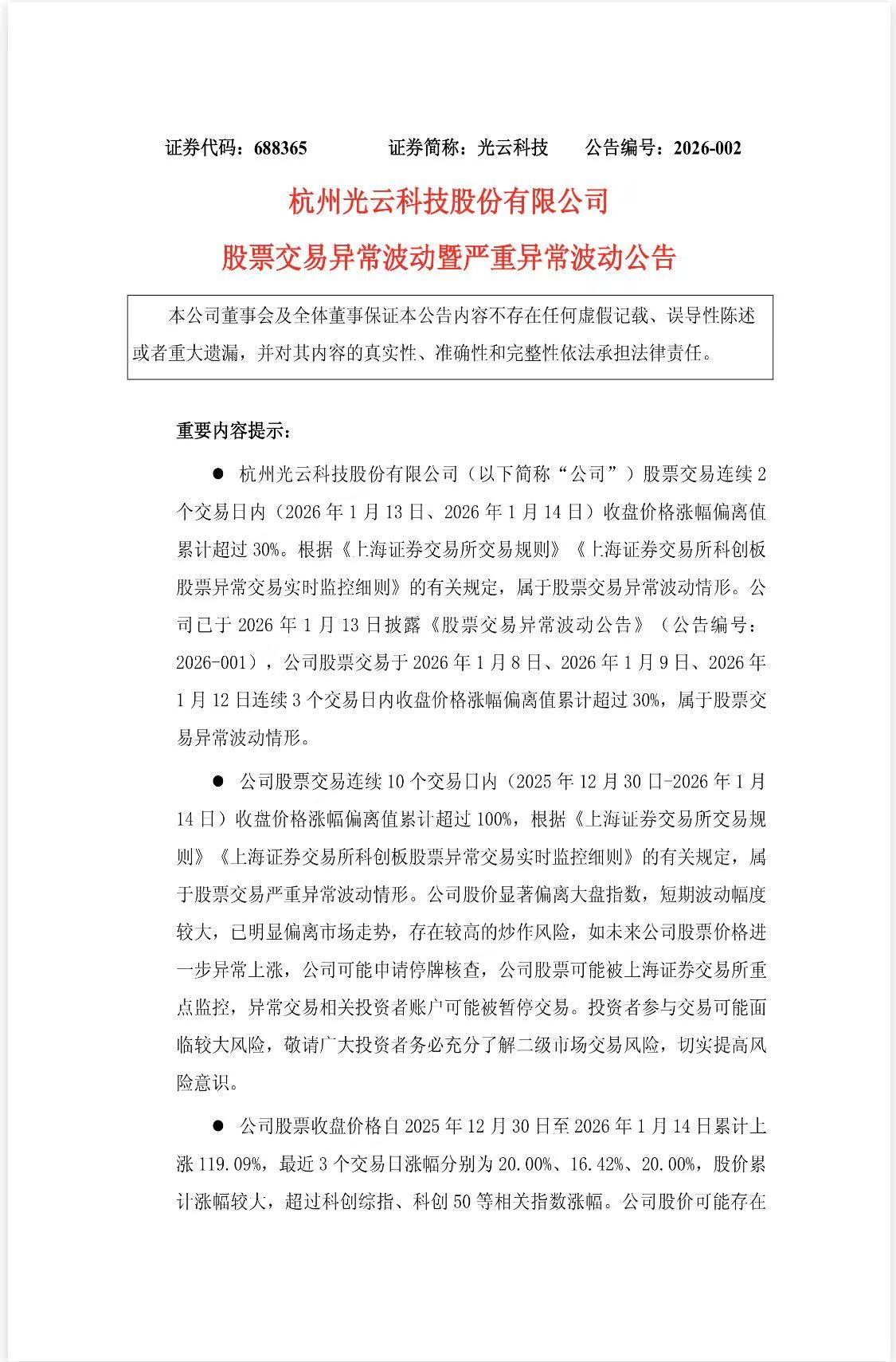 当日,光云科技发布公告,公司股票在连续10个交易日内收盘价格涨幅偏离值累计超100%,股价走势显著偏离大盘,构成严重异常波动情形。