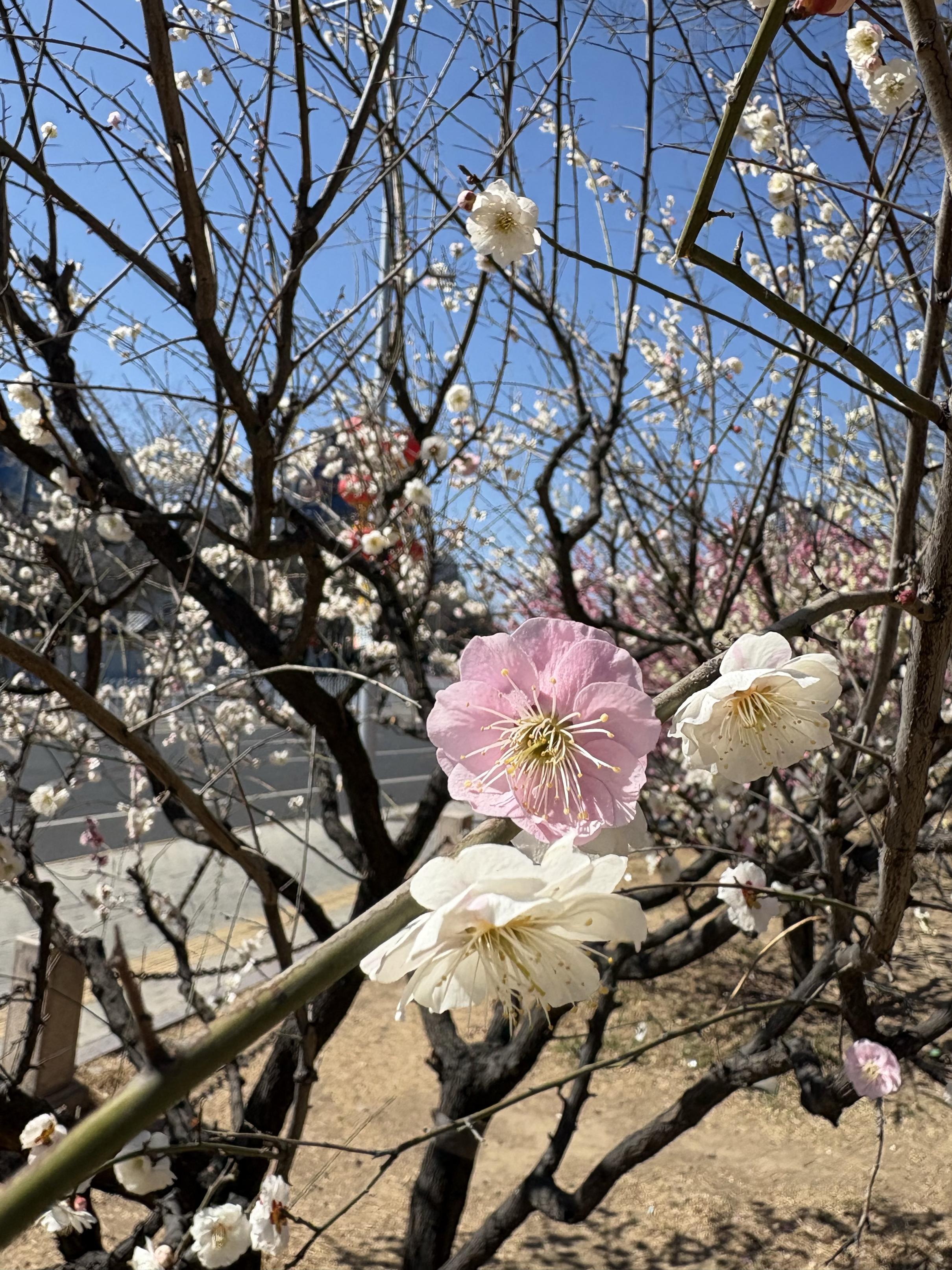 城墙高大古朴,自有威严之美,上千株梅花沿城墙南侧分布,暗香浮动。公园西侧路边,不少游客围着两株梅花拍照。凑近一看,很多花都是双色的,白色花朵中跳出一两瓣粉色花瓣。