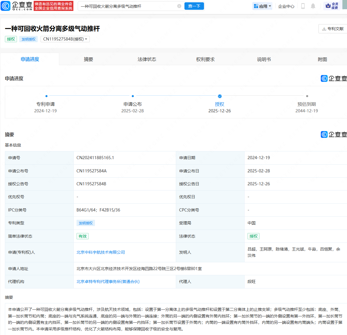 近日,北京中科宇航技术有限公司申请的“一种可回收火箭分离多级气动推杆”专利获授权。专利摘要显示,本申请涉及航天技术领域,包括:设置于第一分离体上的多级气动推杆和设置于第二分离体上的止推支架;多级气动推杆至少包括:底座、外筒、第一加长筒节和内筒;底座的一端与充气系统连通,底座的另一端与外筒的一端连接;外筒的另一端的内侧设置有外筒内挡环;第一加长筒节的一端的外侧设置有第一外挡环,第一加长筒节的一端的内侧设置有主内挡环,第一加长筒节的另一端的内侧设置有第一内挡环;第一加长筒节设置于外筒内;内筒的一端设置有内筒外挡环,内筒的另一端设置有内筒端头;内筒设置于第一加长筒节内。本申请采用多级推杆结构,优化了火箭结构布局,能够保障回收子级的安全与复用。